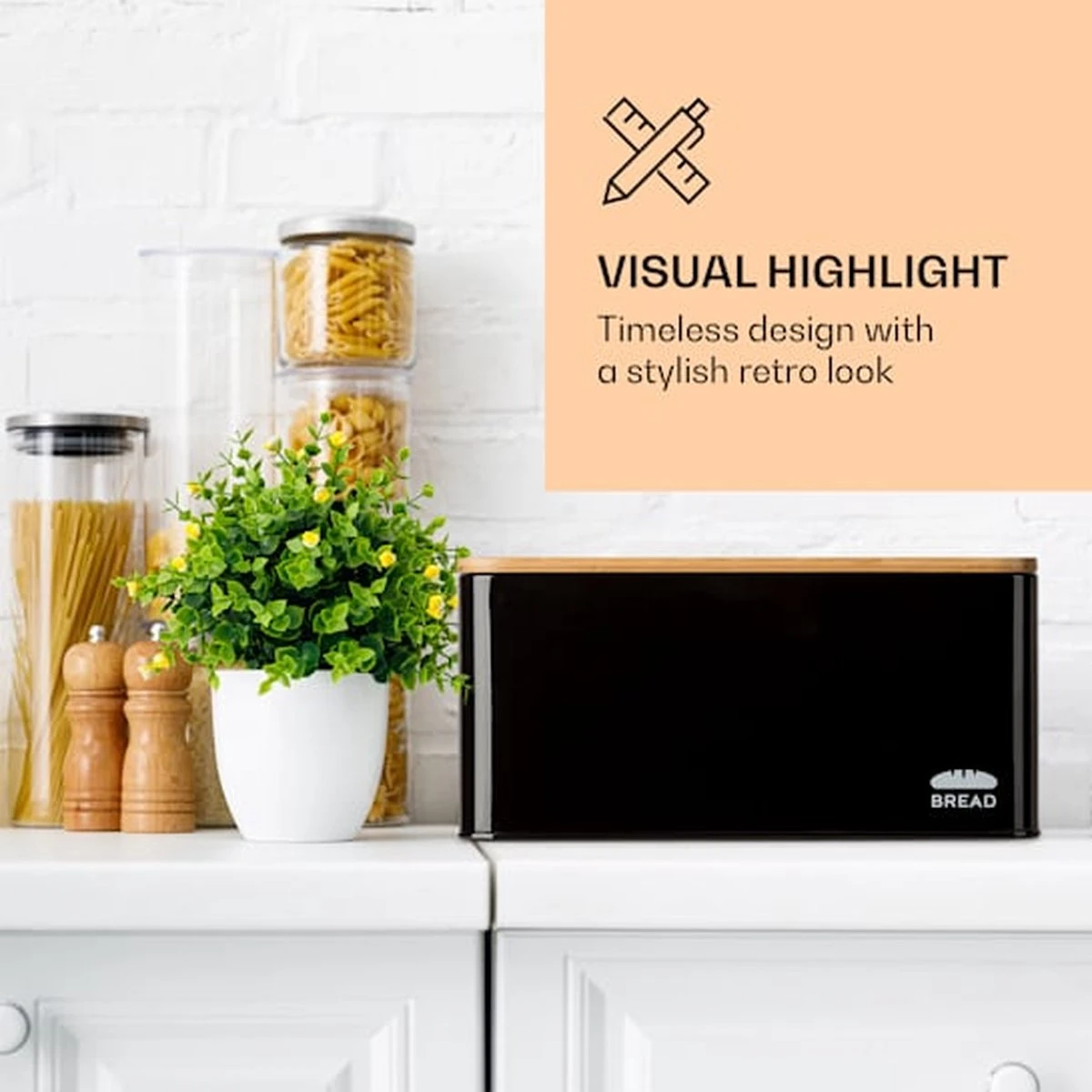 Praktisch en chique! De grote metalen broodtrommel Oklahoma met snijplank in moderne look van Klarstein is niet alleen zeer stabiel en groot genoeg voor het gelijktijdig bewaren van meerdere broden en bakkerijproducten, maar ook een absolute blikvanger in de keuken. Dankzij de ventilatiegaatjes aan de achterkant van de broodbox is voor de belangrijke luchtcirculatie gezorgd. Dat vermindert vochtigheid aan de binnenkant en houdt je brood lang krokant en vers! De praktische en robuuste houten deksel van bamboe kan bovendien als snijplank worden gebruikt. Met afmetingen van 35,5 x 15,5 x 23 cm (BxHxD) past deze broodopslag makkelijk op je sideboard, je keukenblok of in de ruime keukenkast.