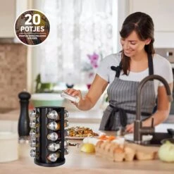 Merkloos Draaibaar Kruidenrek Met 20 Kruidenpotjes – Kruidenrek Staand – Aanrecht Organiser – Glazen Potjes Met Deksel – Inclusief 32 Etiketten En 1 Uitwisbare Stift – Ronde Afwerking – Zwart
