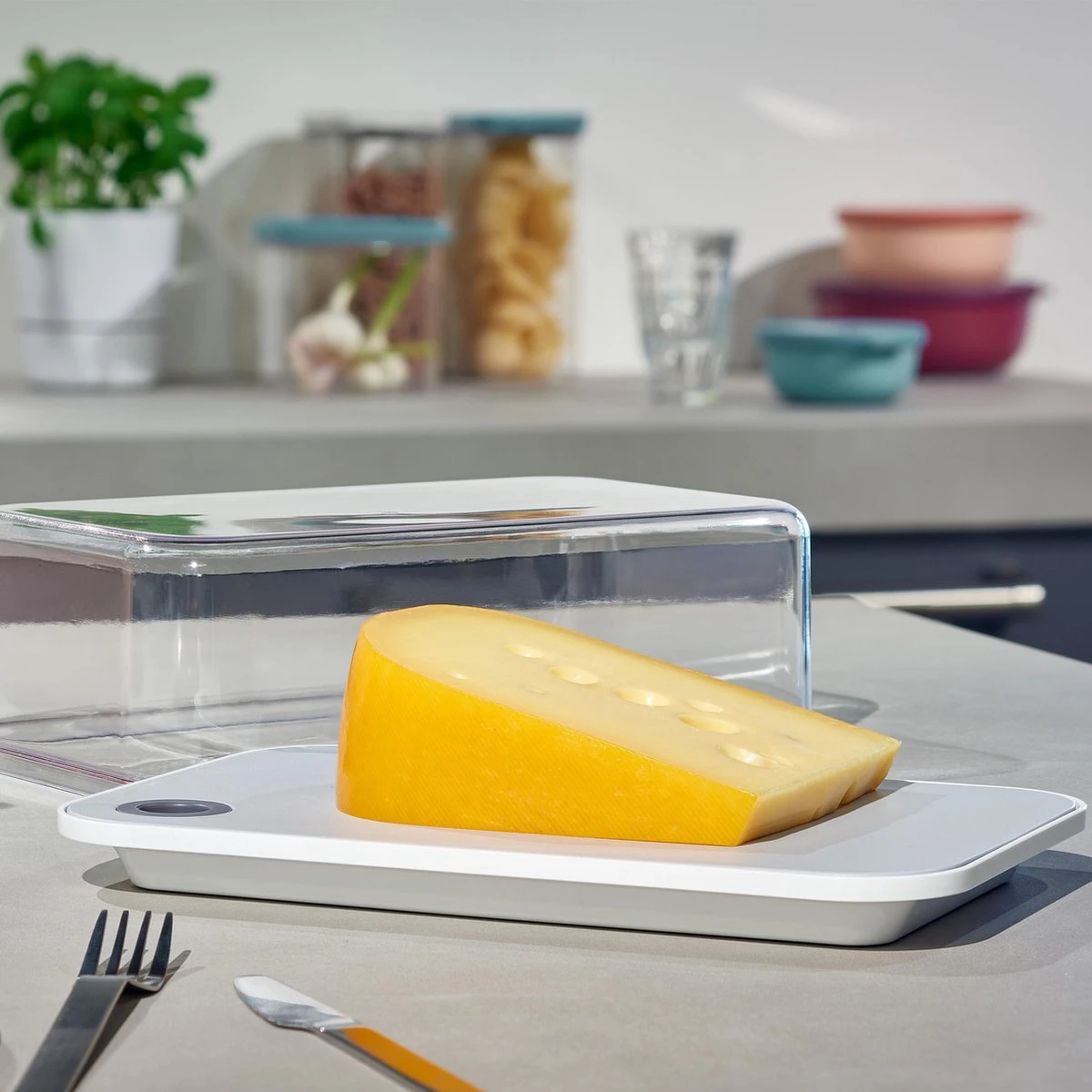 De Modula kaasstolp van Mepal is voorzien van een uitneembare grijze snijplank en geeft direct zicht op de inhoud, ook in de koelkast! De transparante vershouddoos zorgt voor een goede afsluiting, waardoor deze stolp geschikt is voor het bewaren én presenteren van diverse kaassoorten, zonder nare luchtjes. De Modula bewaardozen van Mepal zijn verkrijgbaar in verschillende maten en uitvoeringen, liggen goed in de hand en zijn makkelijk te openen. Bovendien zijn ze stapelbaar en vaatwasmachinebestendig. Hoe veeleisend u ook bent: Modula bewaardozen zijn erop berekend!